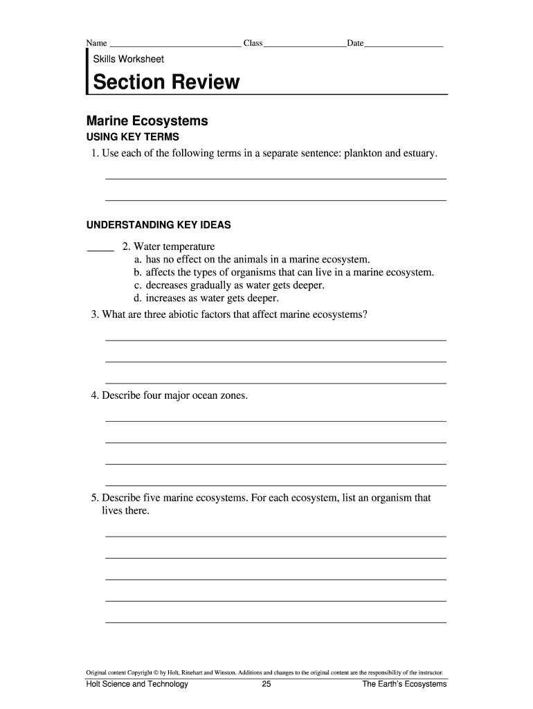Name Class Date Skills Worksheet Section Review Marine Ecosystems USING KEY TERMS 1. Use each of the following terms in a separate sentence: plankton and estuary. UNDERSTANDING KEY IDEAS 2. Water