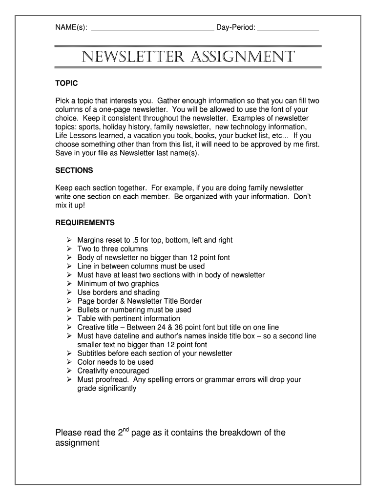 NAME(s): Period: Newsletter assignment TOPIC Pick a topic that interests you. Gather enough information so that you can fill two columns of a one-page newsletter. You will be allowed to use the font