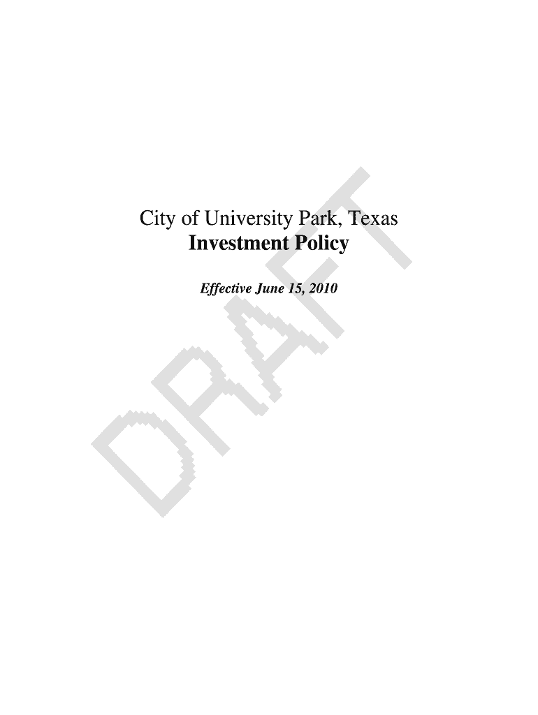 City of University Park, Texas Investment Policy Effective June 15, 2010, City of University Park, Texas Investment Policy CONTENTS Preface...............................................................................................................................1
