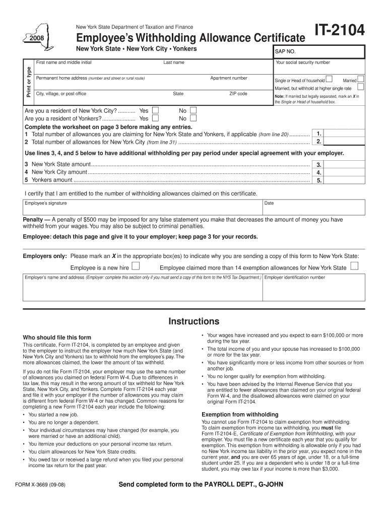 Reset Form New York State Department of Taxation and Finance Employees Withholding Allowance Certificate New York State New York City Yonkers Print or type First name and middle initial IT2104 SAP