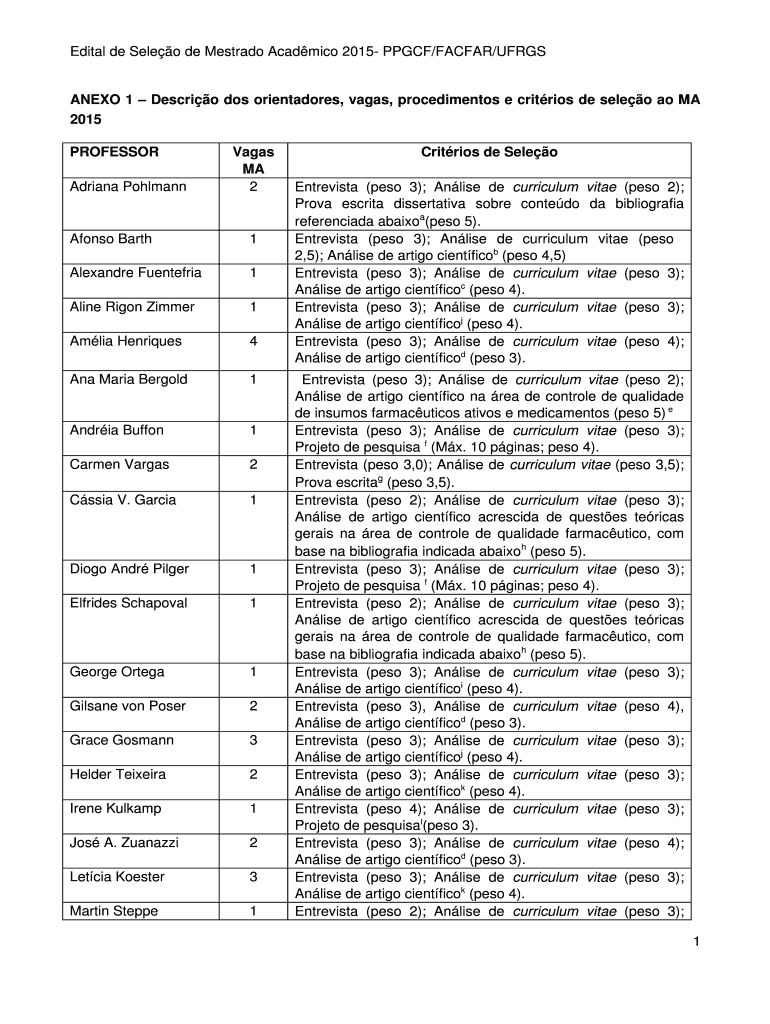 EditaldeSeleodeMestradoAcadmico2015PPGCF/FACTOR/FROGS ANEXO1Descriodosorientadores,Vegas, procedimentosecritriosdeseleoaoMA 2015 PROFESSOR AdrianaPohlmann Vegas MA 2 AfonsoBarth 1 AlexandreFuentefria
