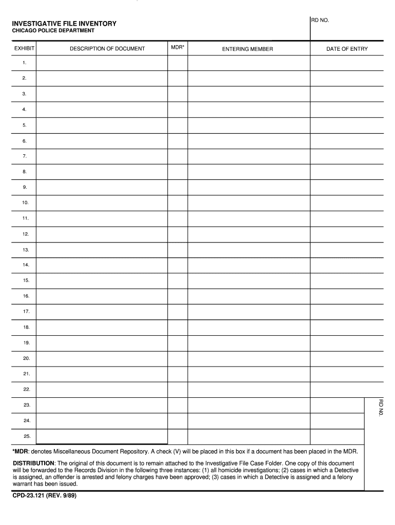 RD NO. INVESTIGATIVE FILE INVENTORY CHICAGO POLICE DEPARTMENT EXHIBIT DESCRIPTION OF DOCUMENT MDR* ENTERING MEMBER DATE OF ENTRY 1. 2. 3. 4. 5. 6. 7. 8. 9. 10. 11. 12. 13. 14. 15. 16. 17. 18. 19.
