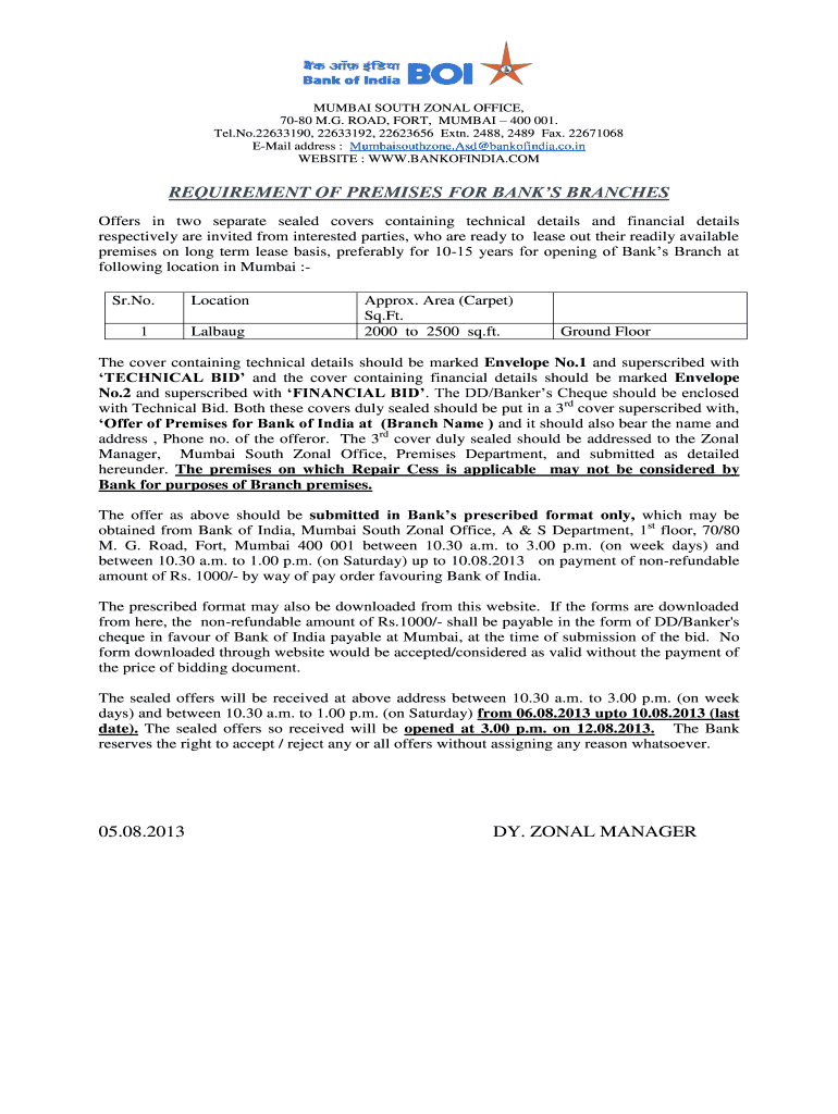 MUMBAI SOUTH ZONAL OFFICE, 7080 M.G. ROAD, FORT, MUMBAI 400 001. Tel.No.22633190, 22633192, 22623656 Exon. 2488, 2489 Fax. 22671068 Email address : Mumbaisouthzone. ASD bankofindia.co.in WEBSITE :