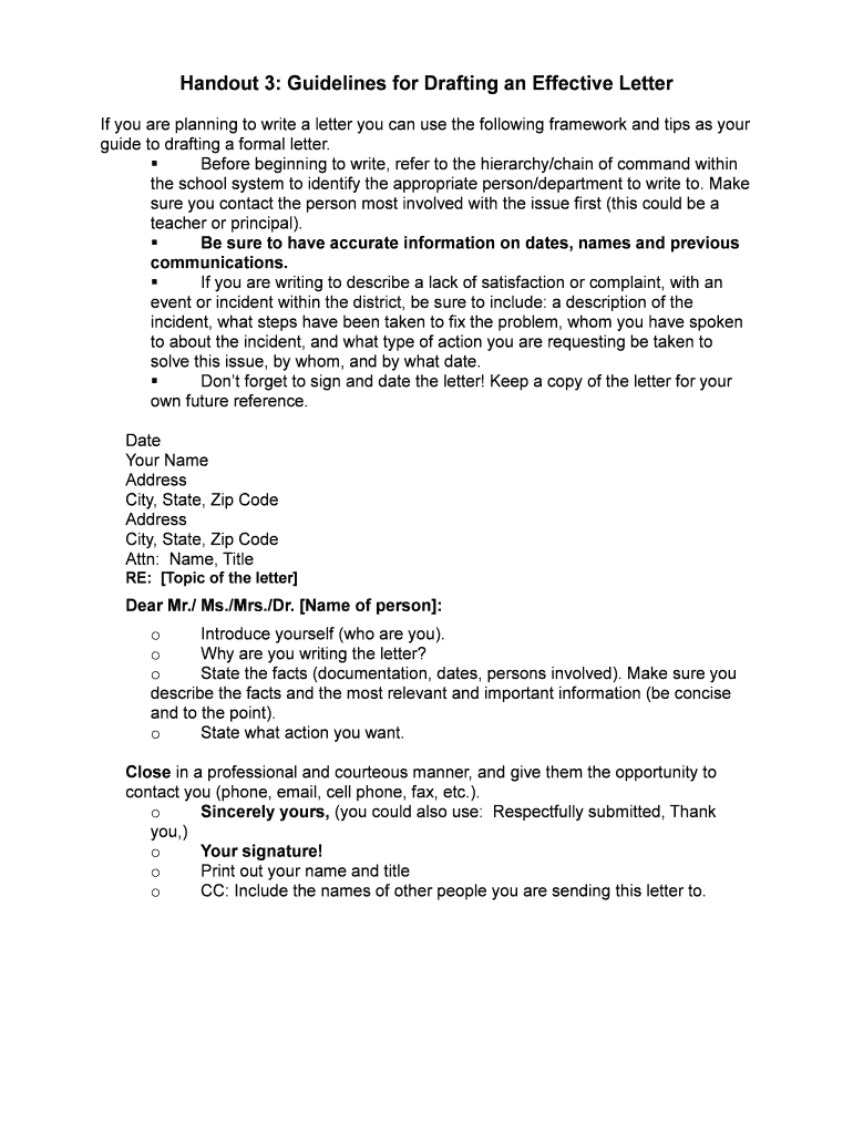 Handout 3: Guidelines for Drafting an Effective Letter If you are planning to write a letter you can use the following framework and tips as your guide to drafting a formal letter. Before beginning