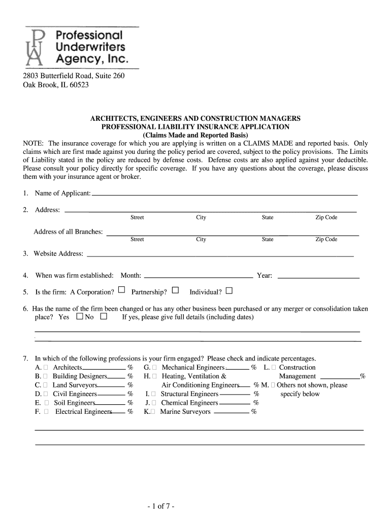 2803 Butterfield Road, Suite 260 Oak Brook, IL 60523 ARCHITECTS, ENGINEERS AND CONSTRUCTION MANAGERS PROFESSIONAL LIABILITY INSURANCE APPLICATION (Claims Made and Reported Basis) NOTE: The insurance