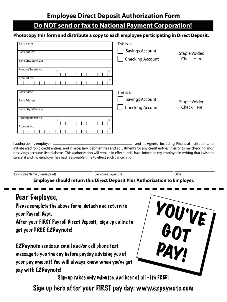 Employee Direct Deposit Authorization Form Do NOT send or fax to National Payment Corporation! Photocopy this form and distribute a copy to each employee participating in Direct Deposit. This is a: