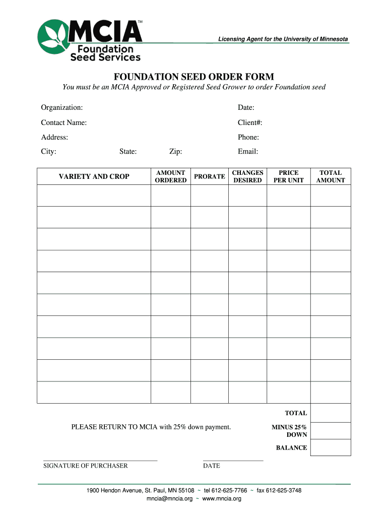 Licensing Agent for the University of Minnesota FOUNDATION SEED ORDER FORM You must be an CIA Approved or Registered Seed Grower to order Foundation seed Organization: Date: Contact Name: Client#: