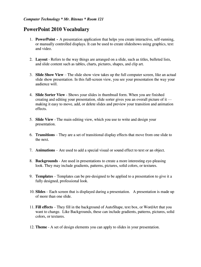 Fill out your powerpoint 2010 vocabulary online with pdfFiller!