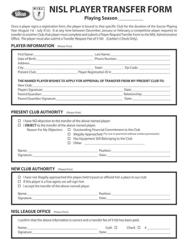The nisl player transfer form must include details such as player's name, date of birth, previous team, new team, transfer fee (if applicable), and signatures of both teams involved.