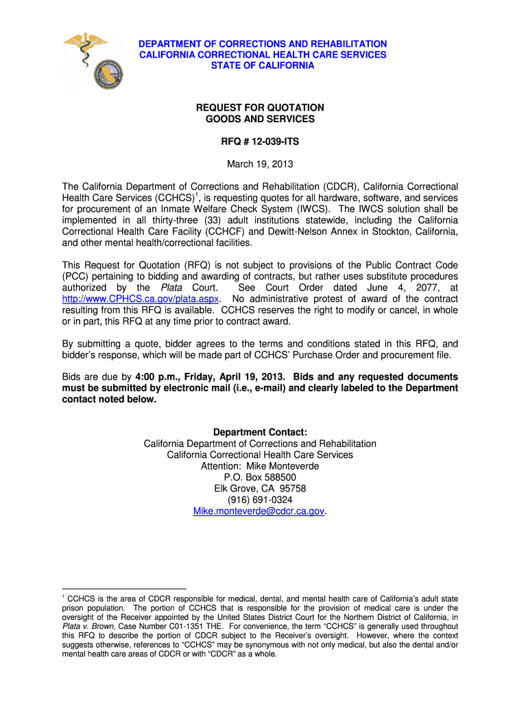 Get the free Request For Quotation – Inmate Welfare Check System - cphcs ca