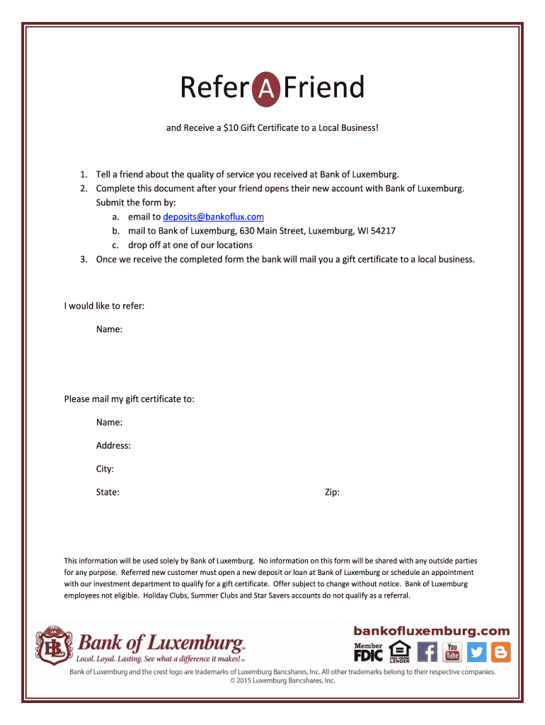 Refer A Friend and Receive a $10 Gift Certificate to a Local Business! 1. Tell a friend about the quality of service you received at Bank of Luxembourg. 2. Complete this document after your friend