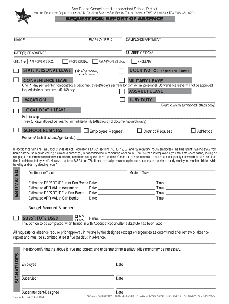 San Benito Consolidated Independent School District Human Resources Department 240 N. Crockett Street San Benito, Texas 78586 (956) 3616150 FAX (956) 3616291 REQUEST FOR: REPORT OF ABSENCE NAME EMPLOYEE