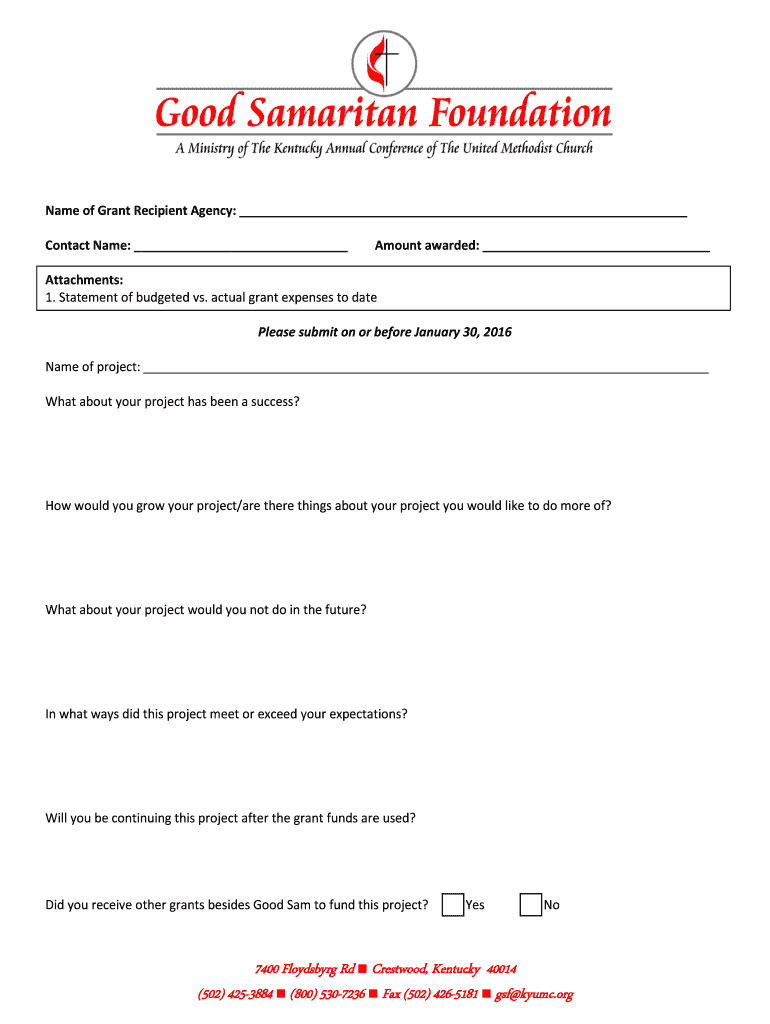 Name of Grant Recipient Agency: Contact Name: Amount awarded: Attachments: 1. Statement of budgeted vs. actual grant expenses to date Please submit on or before January 30, 2016, Name of project: