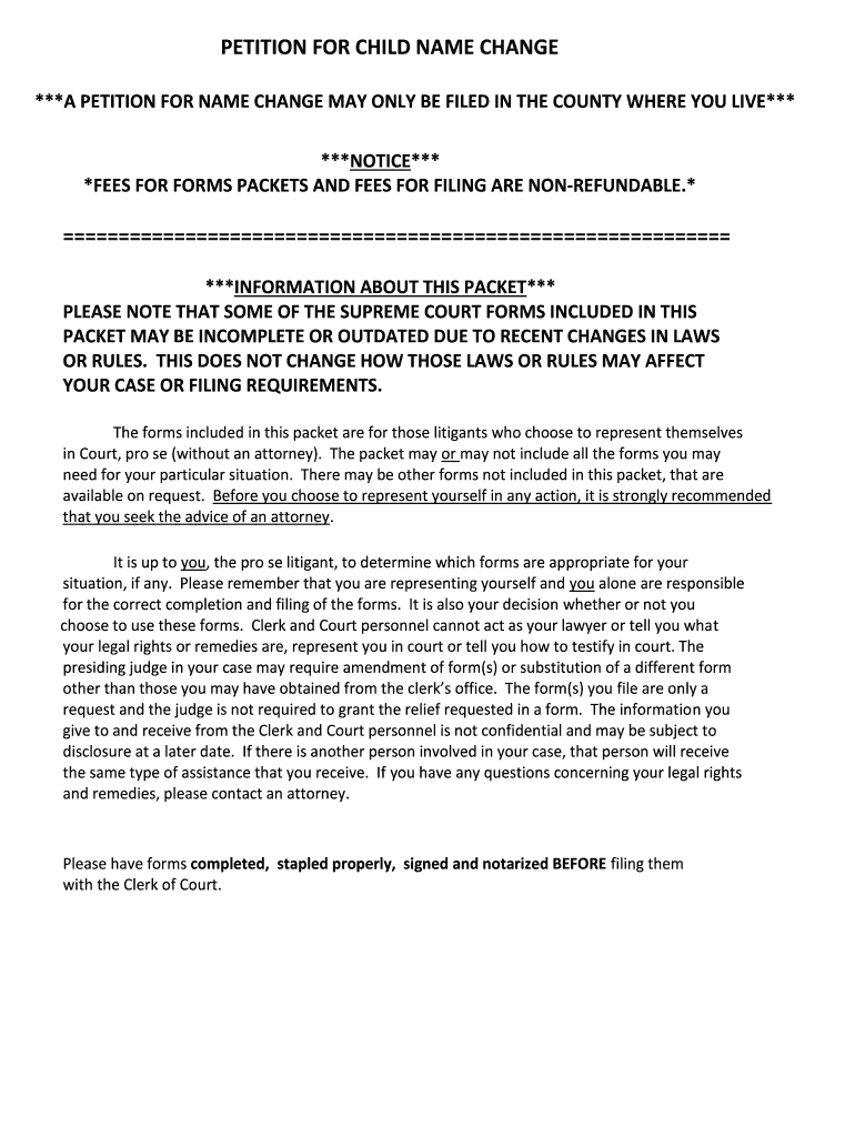 PETITION FOR CHILD NAME CHANGE ***A PETITION FOR NAME CHANGE MAY ONLY BE FILED IN THE COUNTY WHERE YOU LIVE*** ***NOTICE*** *FEES FOR FORMS PACKETS AND FEES FOR FILING ARE NONREFUNDABLE.* ***INFORMATION