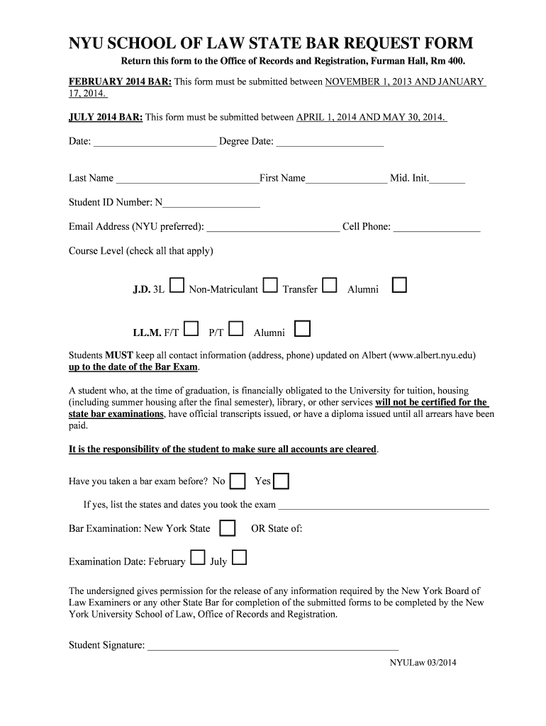 NYU SCHOOL OF LAW STATE BAR REQUEST FORM Return this form to the Office of Records and Registration, Furman Hall, Rm 400. FEBRUARY 2014 BAR: This form must be submitted between NOVEMBER 1, 2013, AND
