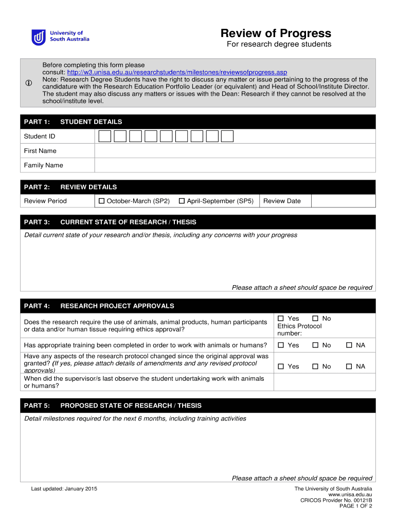 Review of Progress For research degree students Before completing this form please consult: http://w3.unisa.edu.au/researchstudents/milestones/reviewsofprogress.asp Note: Research Degree Students