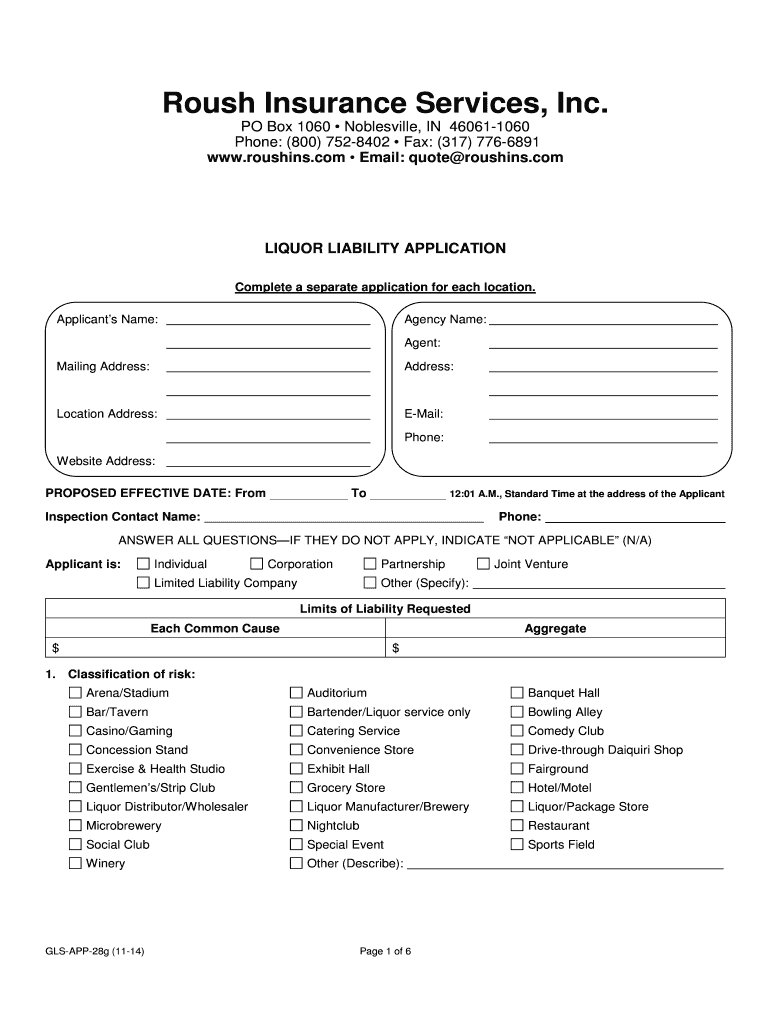 Rough Insurance Services, Inc. PO Box 1060 Noblesville, IN 460611060 Phone: (800) 7528402 Fax: (317) 7766891 www.roushins.com Email: quote roushins.com LIQUOR LIABILITY APPLICATION Complete a separate