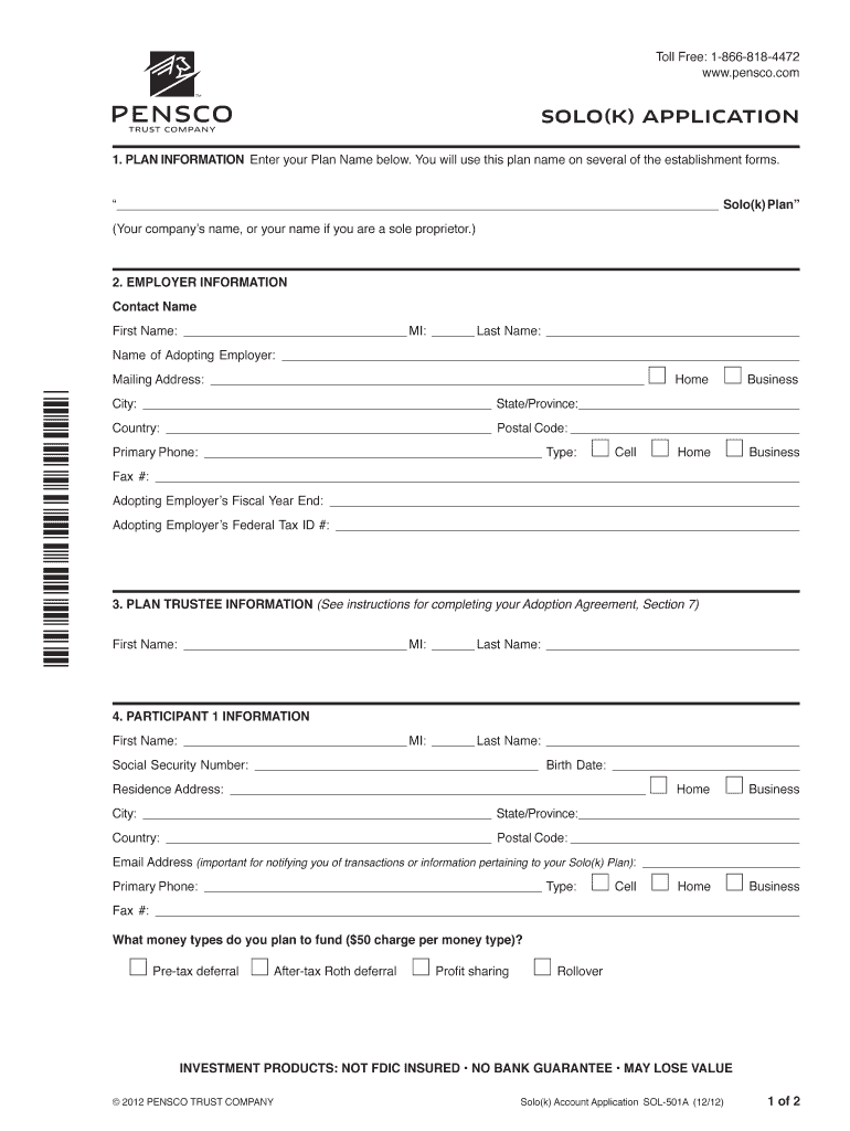 Toll Free: 18668184472 www.pensco.com SOLO(K) APPLICATION 1. PLAN INFORMATION Enter your Plan Name below. You will use this plan name on several of the establishment forms. Solo(k) Plan (Your companies