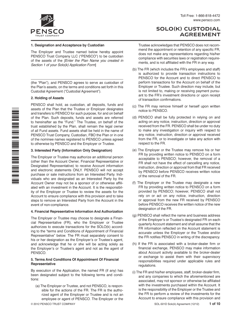 Toll Free: 18668184472 www.pensco.com SOLO(K) CUSTODIAL AGREEMENT 1. Designation and Acceptance by Custodian The Employer and Trustee named below hereby appoint PEN SCO Trust Company LLC (PEN SCO)