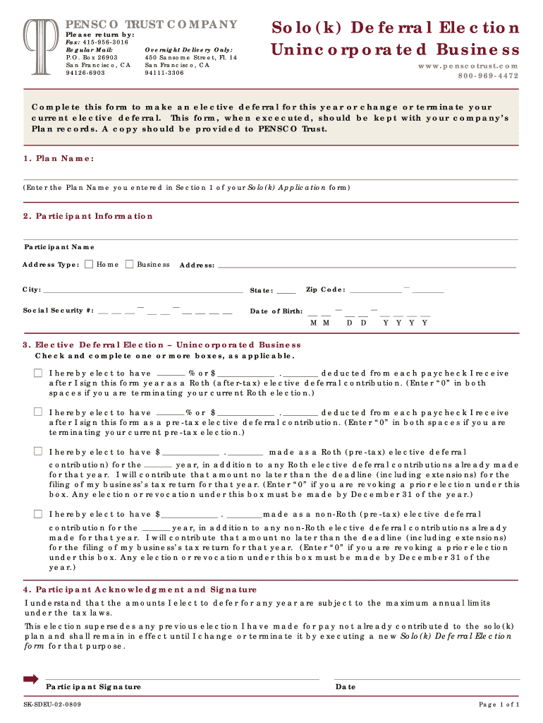 Solo(k) Deferral Election Unincorporated Business PEN SC O TRUST C COMPANY Please return b y : F an x : 415-956-3016 Regular Mail: P. O. Box 26903 San Francisco, CA 94126-6903 Overnight Delivery Only: