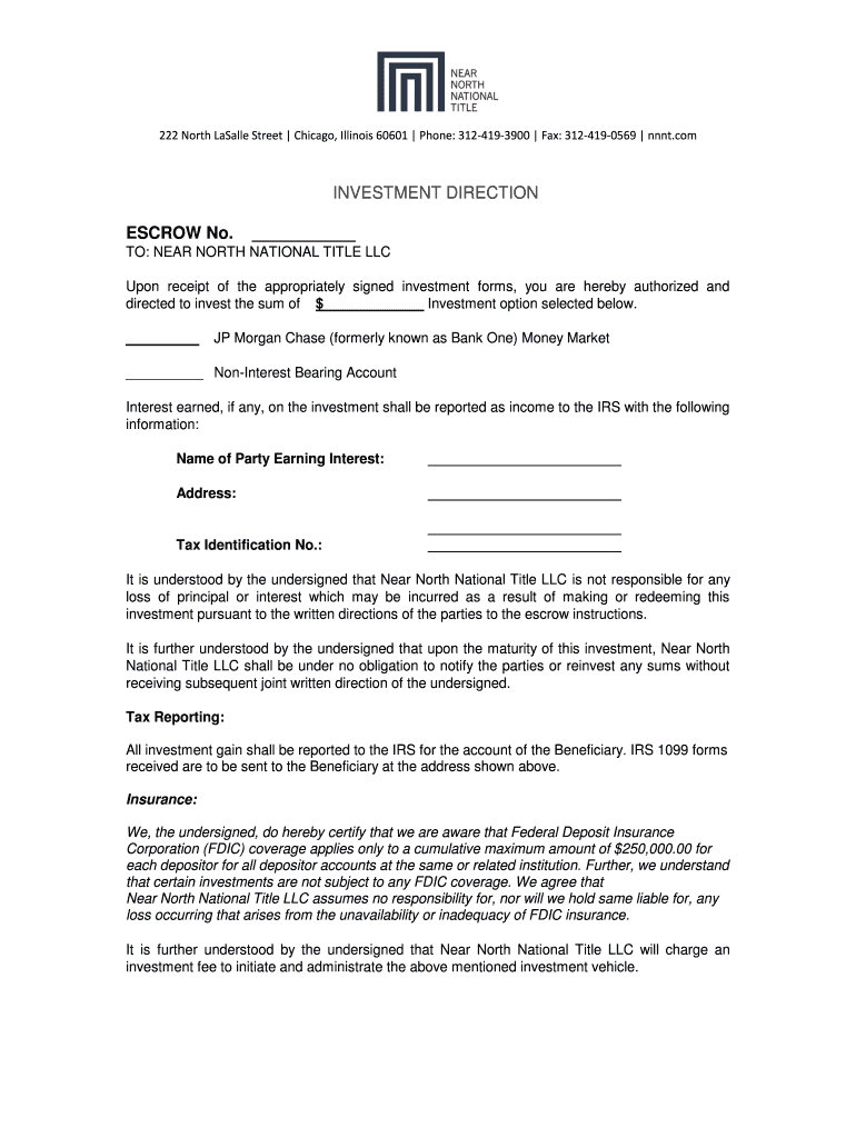 222 North Basally Street Chicago, Illinois 60601 Phone: 3124193900 Fax: 3124190569 nnnt.com INVESTMENT DIRECTION ESCROW No. TO: NEAR NORTH NATIONAL TITLE LLC Upon receipt of the appropriately signed