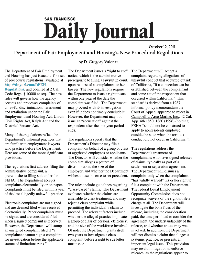 October 12, 2011Department of Fair Employment and Housings New Procedural Regulations by D. Gregory Valencia The Department of Fair Employment and Housing has just issued its first set of procedural
