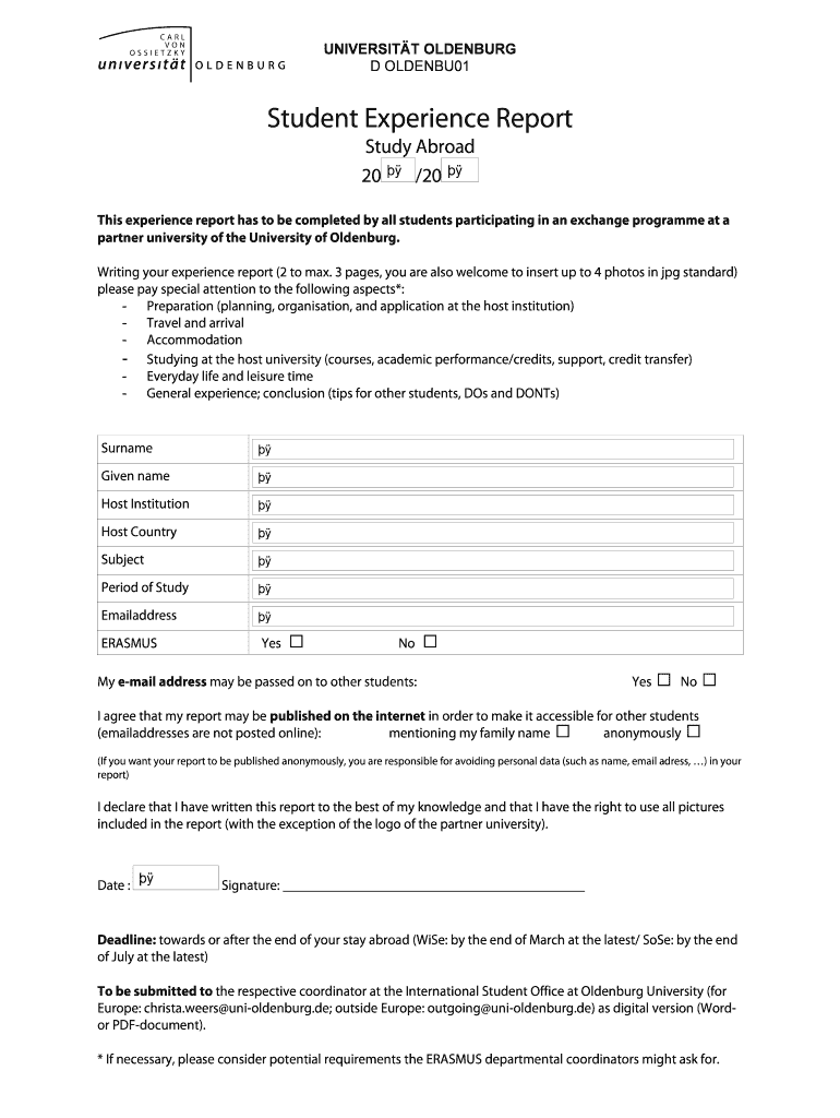 UNIVERSITY OLDENBURG D OLDENBU01 Student Experience Report Study Abroad 20 /20 This experience report has to be completed by all students participating in an exchange program at a partner university