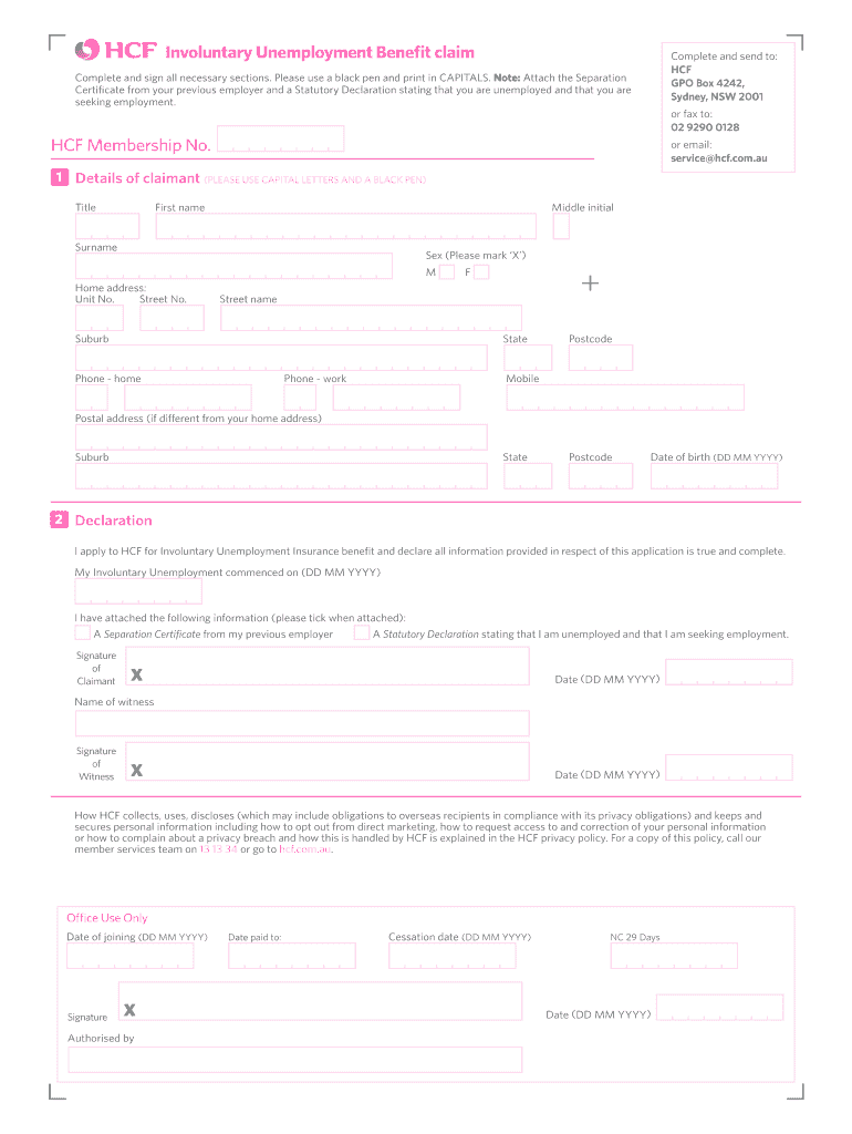 Involuntary Unemployment Benefit claim Complete and send to: CF GPO Box 4242, Sydney, NSW 2001 Complete and sign all necessary sections. Please use a black pen and print in CAPITALS. Note: Attach