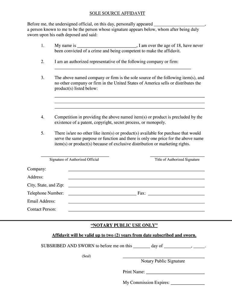 SOLE SOURCE AFFIDAVIT Before me, the undersigned official, on this day, personally appeared a person known to me to be the person whose signature appears below, whom after being duly sworn upon his