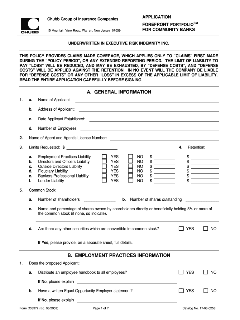 APPLICATION Chubb Group of Insurance Companies FOREFRONT PORTFOLIOS FOR COMMUNITY BANKS 15 Mountain View Road, Warren, New Jersey 07059 UNDERWRITTEN IN EXECUTIVE RISK INDEMNITY INC. THIS POLICY PROVIDES
