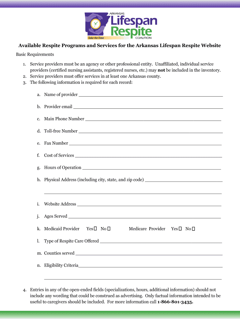 Available Respite Programs and Services for the Arkansas Lifespan Respite Website Basic Requirements 1. Service providers must be an agency or other professional entity. Unaffiliated, individual service