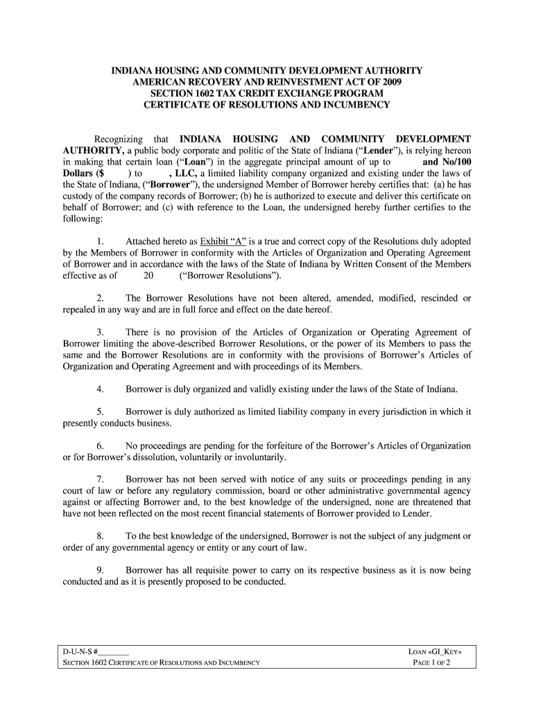 This document certifies the resolutions and incumbency of a limited liability company in relation to a loan from the Indiana Housing and Community Development Authority.