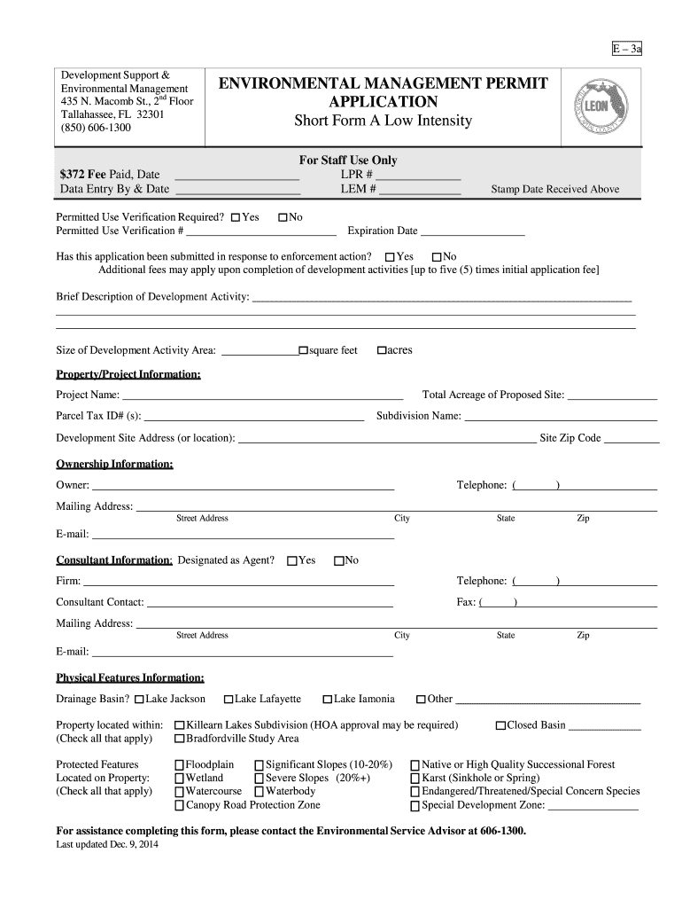 E 3a Development Support & Environmental Management 435 N. Macomb St., 2nd Floor Tallahassee, FL 32301 (850) 6061300 ENVIRONMENTAL MANAGEMENT PERMIT APPLICATION Short Form A Low Intensity For Staff