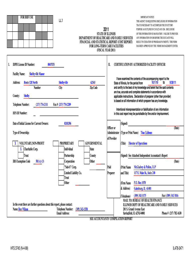 This document serves as a comprehensive financial and statistical report for long-term care facilities in the State of Illinois for the fiscal year 2011, detailing operational data, expenses, income,