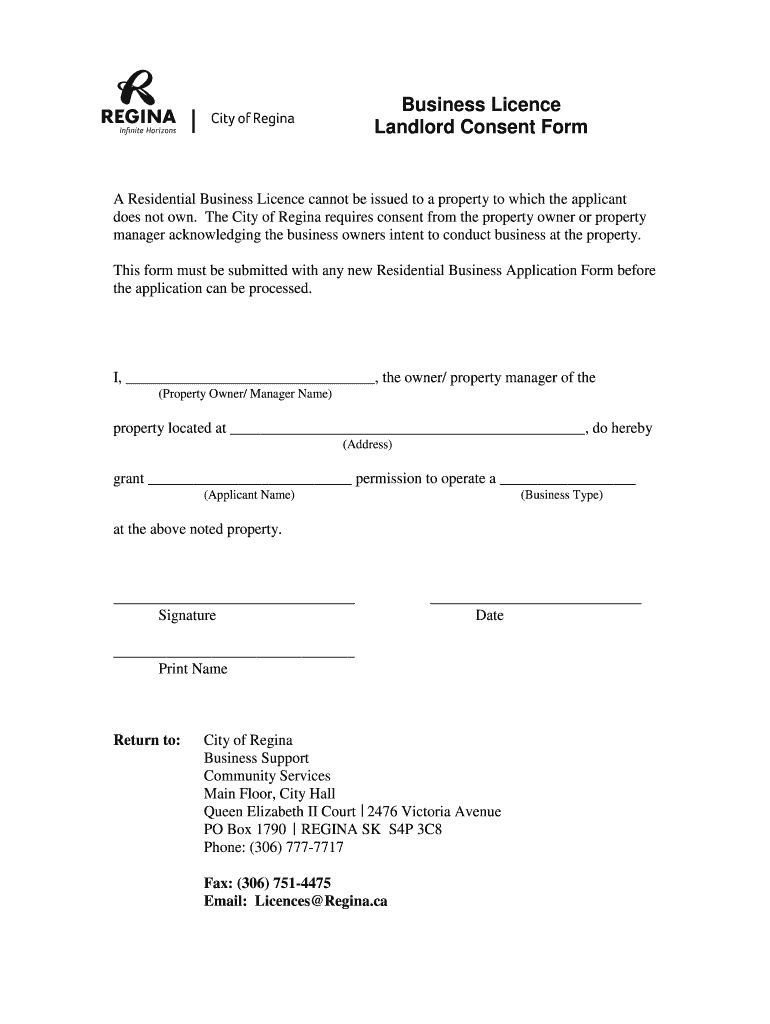 Business License Landlord Consent Form A Residential Business License cannot be issued to a property to which the applicant does not own. The City of Regina requires consent from the property owner