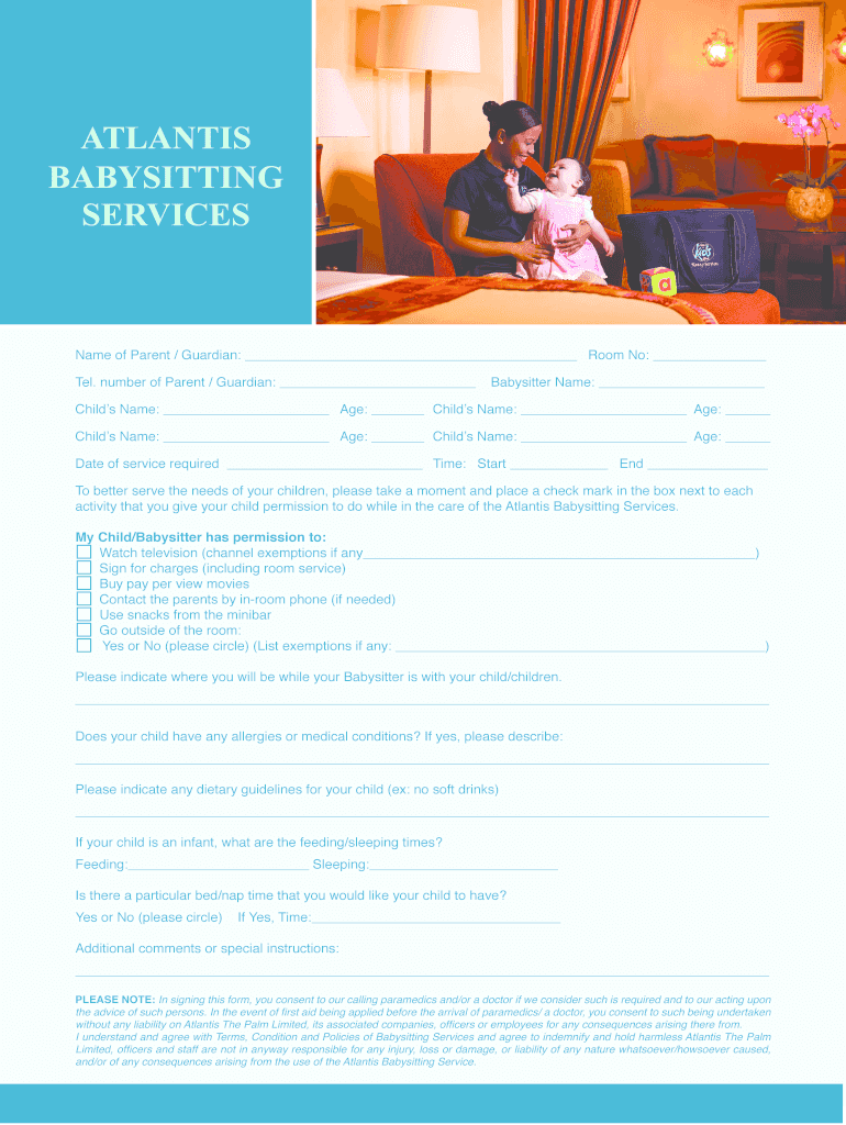 ATLANTIS BABYSITTING SERVICES Name of Parent / Guardian: Room No: Tel. Number of Parent / Guardian: Babysitter Name: Child's Name: Age: Child's Name: Age: Child's Name: Age: Child's Name: Age: Date