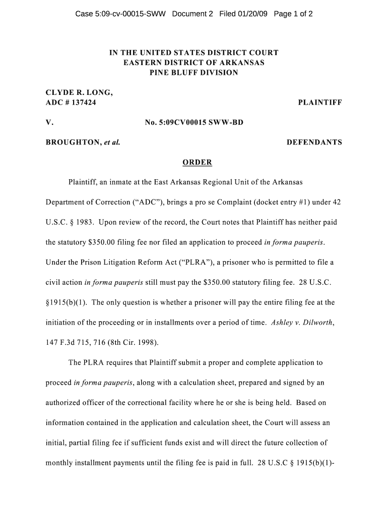 Case 5:09cv00015SWW Document 2 Filed 01/20/09-Page 1 of 2 IN THE UNITED STATES DISTRICT COURT EASTERN DISTRICT OF ARKANSAS PINE BLUFF DIVISION CLYDE R. LONG, ADC # 137424 V. PLAINTIFF No. 5:09CV00015