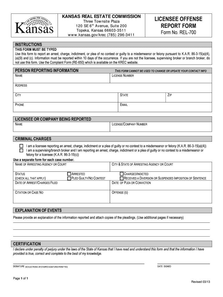 This form is used to report an arrest, charge, indictment, or plea of no contest or guilty to a misdemeanor or felony by a licensee or supervising broker in Kansas.
