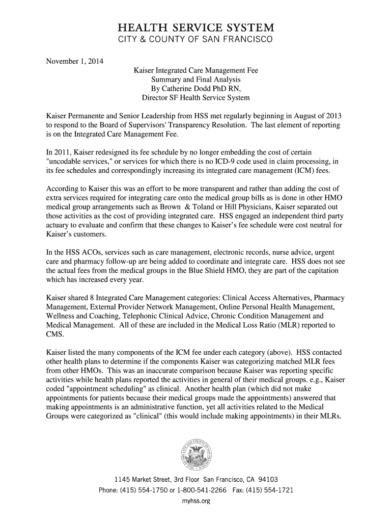November 1, 2014, Kaiser Integrated Care Management Fee Summary and Final Analysis By Catherine Dodd PhD RN, Director SF Health Service System Kaiser Permanent and Senior Leadership from HSS met regularly
