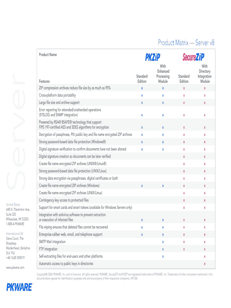 Product Matrix Server v8 Server Product Name United States 648 N. Plankton Ave., Suite 220 Milwaukee, WI 53203 18884PKWARE International/UK Saint Court, The Broadway Maidenhead, Berkshire SL6 1NJ