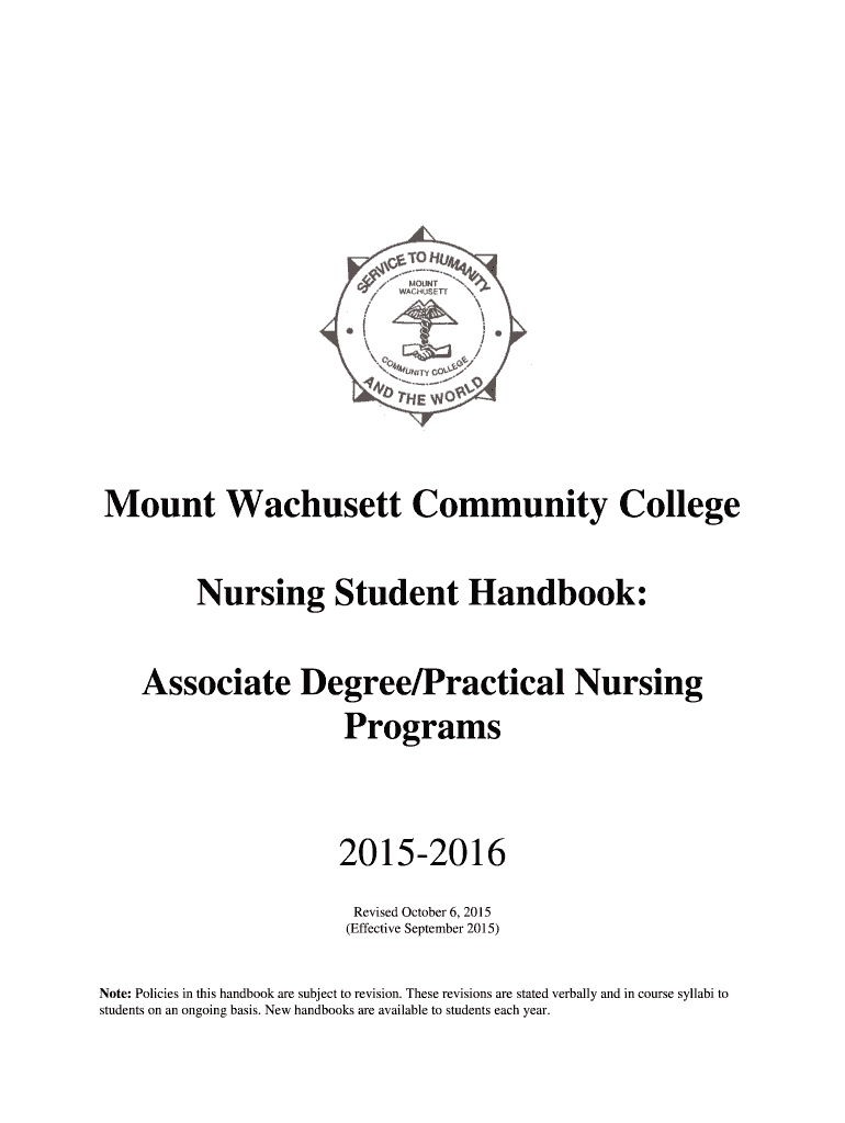Mount Wachusett Community College Nursing Student Handbook: Associate Degree/Practical Nursing Programs 20152016 Revised October 6, 2015 (Effective September 2015) Note: Policies in this handbook