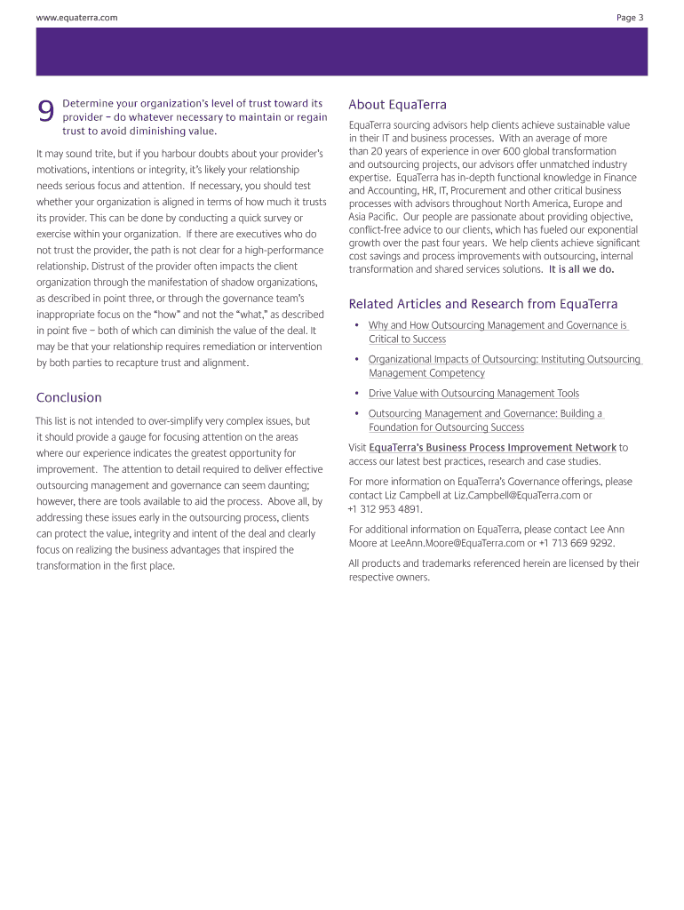 WWW.equaterra.com Page 1 Get to what matters. The Outsourcers Guide to Success: Nine Factors for Great Governance Equator identity the nine critical contributors to outsourcing governance success