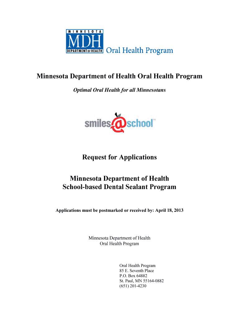 This document outlines the guidelines and requirements for applying to the Minnesota Department of Health's School-based Dental Sealant Program. It provides details on funding, eligibility, application