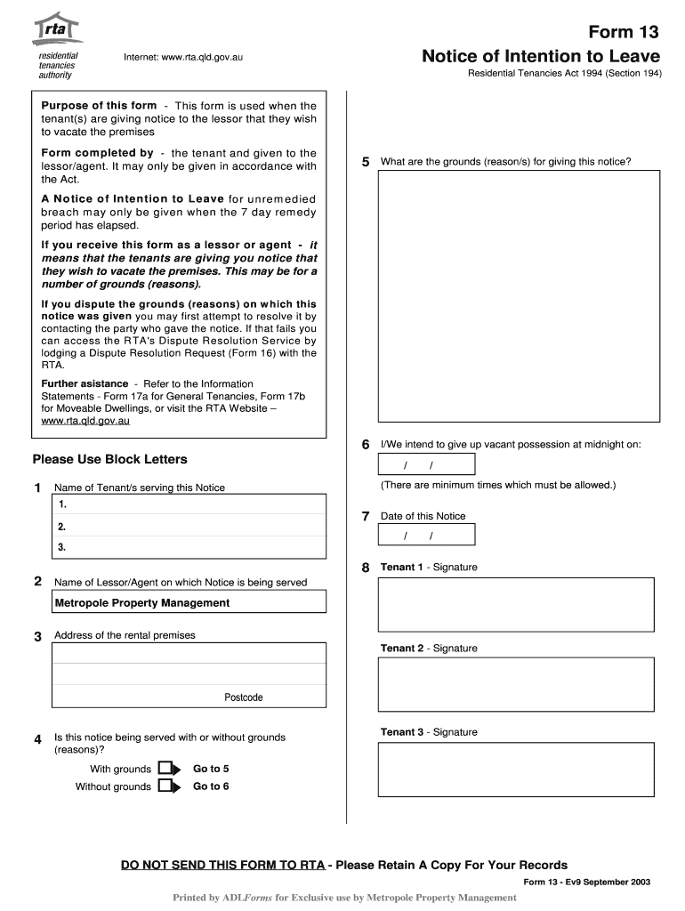 Form 13 Notice of Intention to Leave Internet: www.rta.qld.gov.au Residential Tenancies Act 1994 (Section 194) Purpose of this form is used when the tenant(s) are giving notice to the lessor that