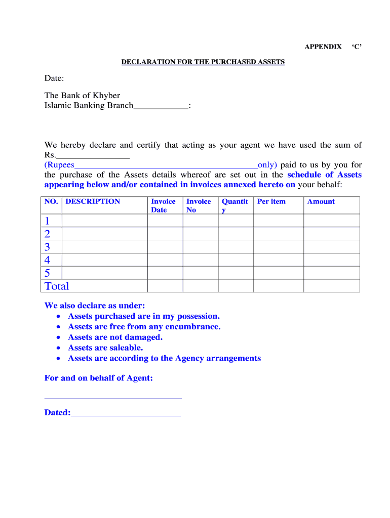APPENDIX C DECLARATION FOR THE PURCHASED ASSETS Date: The Bank of Khyber Islamic Banking Branch : We hereby declare and certify that acting as your agent we have used the sum of Rs. (Rupees only)