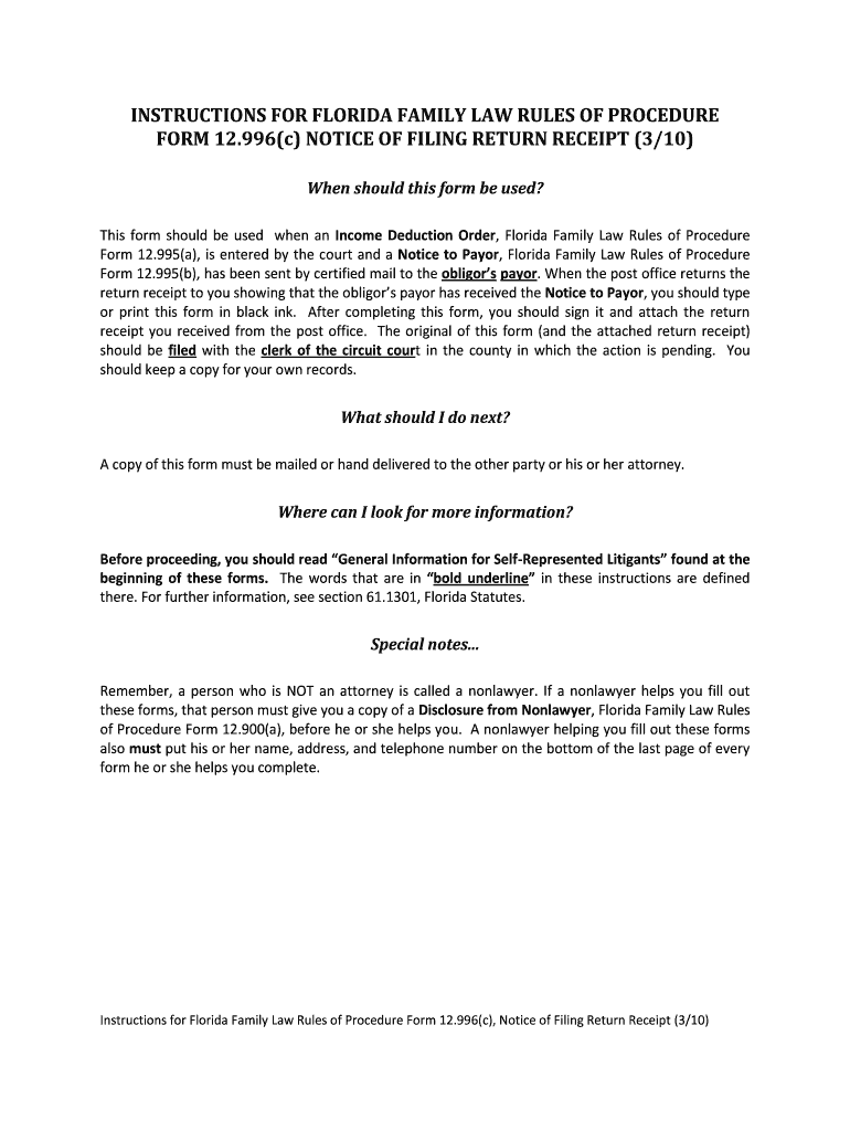 INSTRUCTIONS FOR FLORIDA FAMILY LAW RULES OF PROCEDURE FORM 12.996(c) NOTICE OF FILING RETURN RECEIPT (3/10) When should this form be used? This form should be used when an Income Deduction Order,