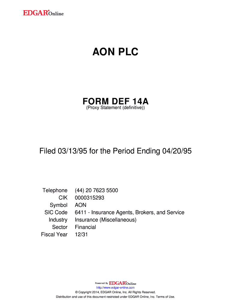 AON PLC FORM DEF 14A (Proxy Statement (definitive)) Filed. 03/13/95 for the Period Ending 04/20/95 Telephone CIK Symbol SIC Code Industry Sector Fiscal Year (44) 20 7623 5500 0000315293 AON 6411 Insurance
