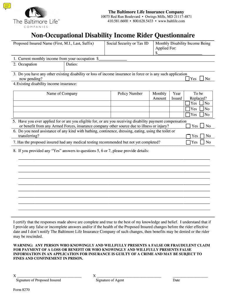 The Baltimore Life Insurance Company 10075 Red Run Boulevard Owings Mills, MD 211174871 410.581.6600 800.628.5433 www.baltlife.com Nonoccupational Disability Income Rider Questionnaire Proposed Insured