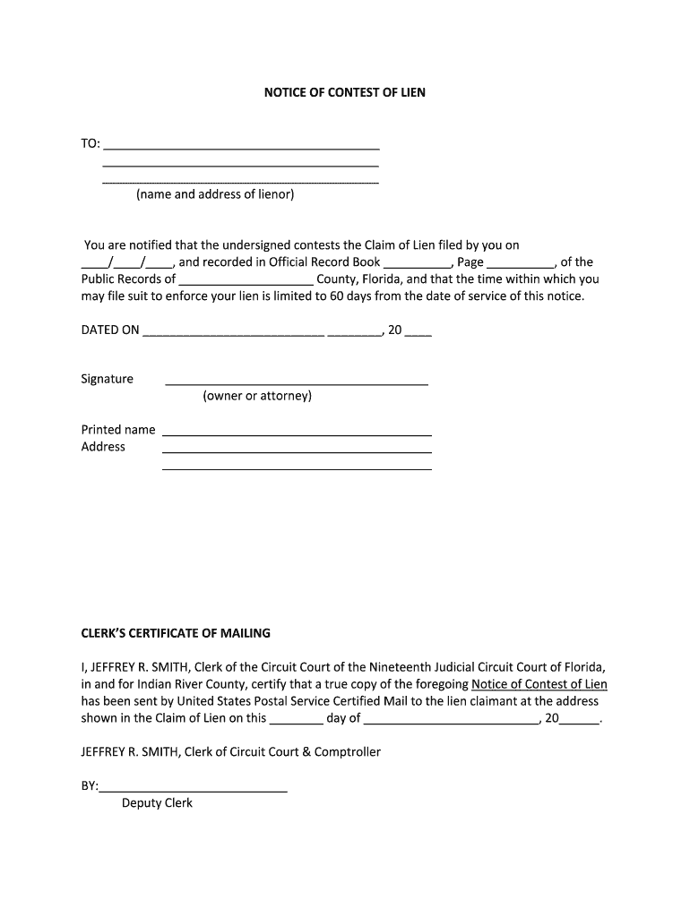 Get the free Notice of Contest of Lien - Indian River County Clerk of - clerk indian-river