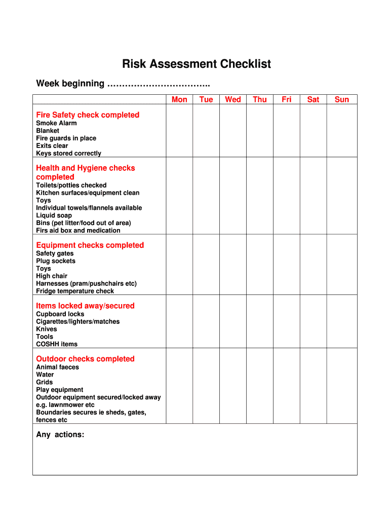 Risk Assessment Checklist Week beginning. Mon Fire Safety check completed Smoke Alarm Blanket Fire guards in place Exits clear Keys stored correctly Health and Hygiene checks completed Toilets/potties